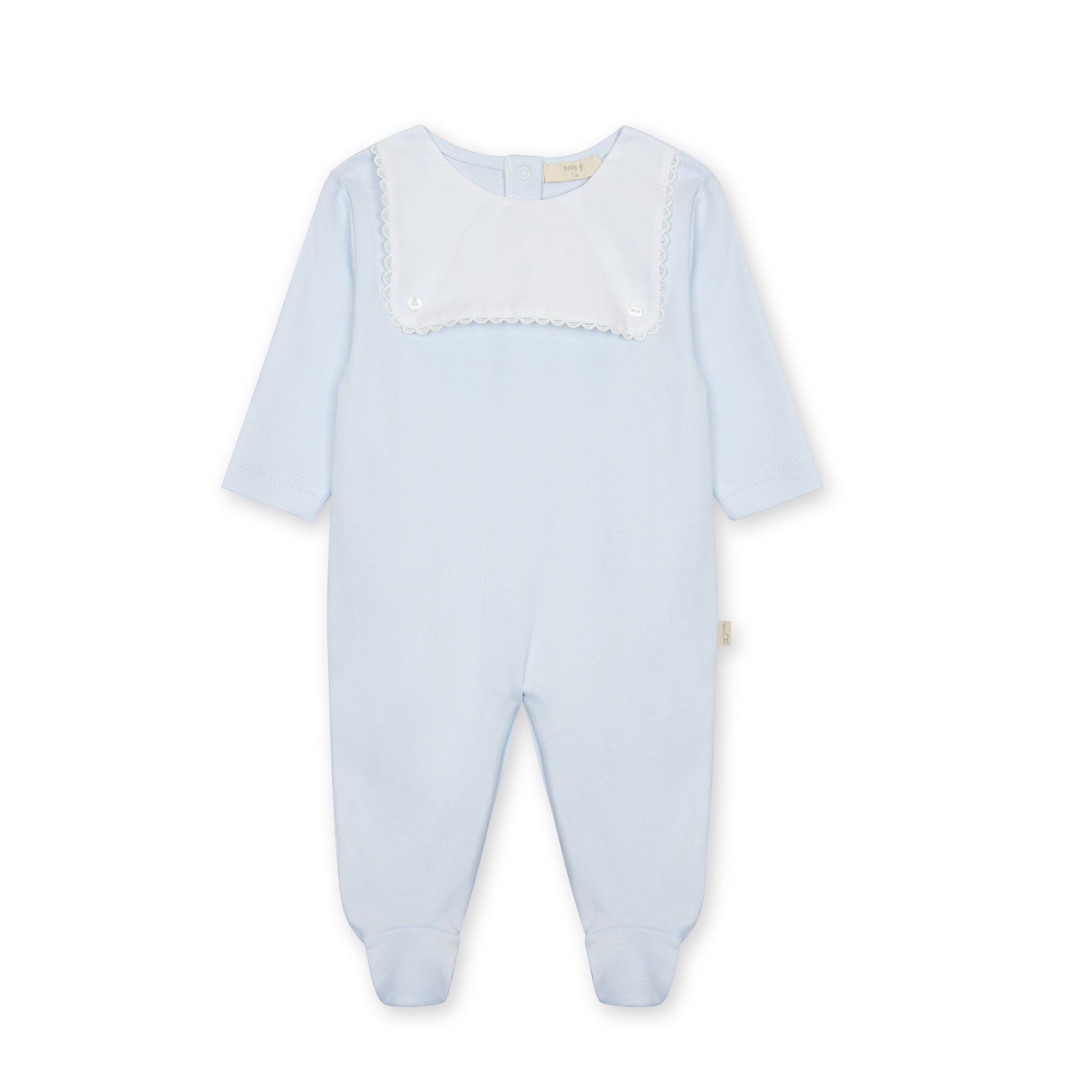 A timeless essential with a refined touch, the Baby Gi Blue Footie with Bib Collar is a beautifully classic piece for baby boys. Crafted from soft cotton, this footie features a crisp white bib-style collar with delicate scalloped trim and subtle button detailing—an elegant nod to traditional baby dressing.
