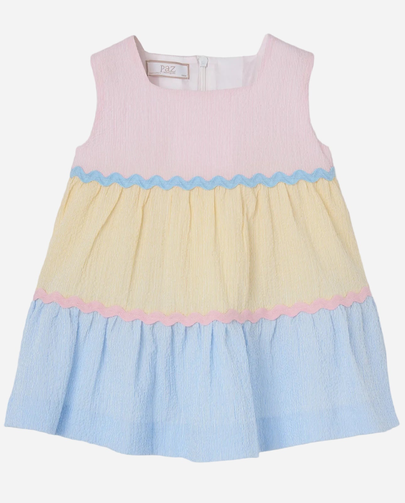 Soft pastels and timeless detail make this Paz Rodriguez tiered dress a beautiful choice for Easter and spring celebrations. Featuring pink, yellow, and blue striped panels with delicate ric-rac trim, this dress captures the light, joyful feeling of the season.