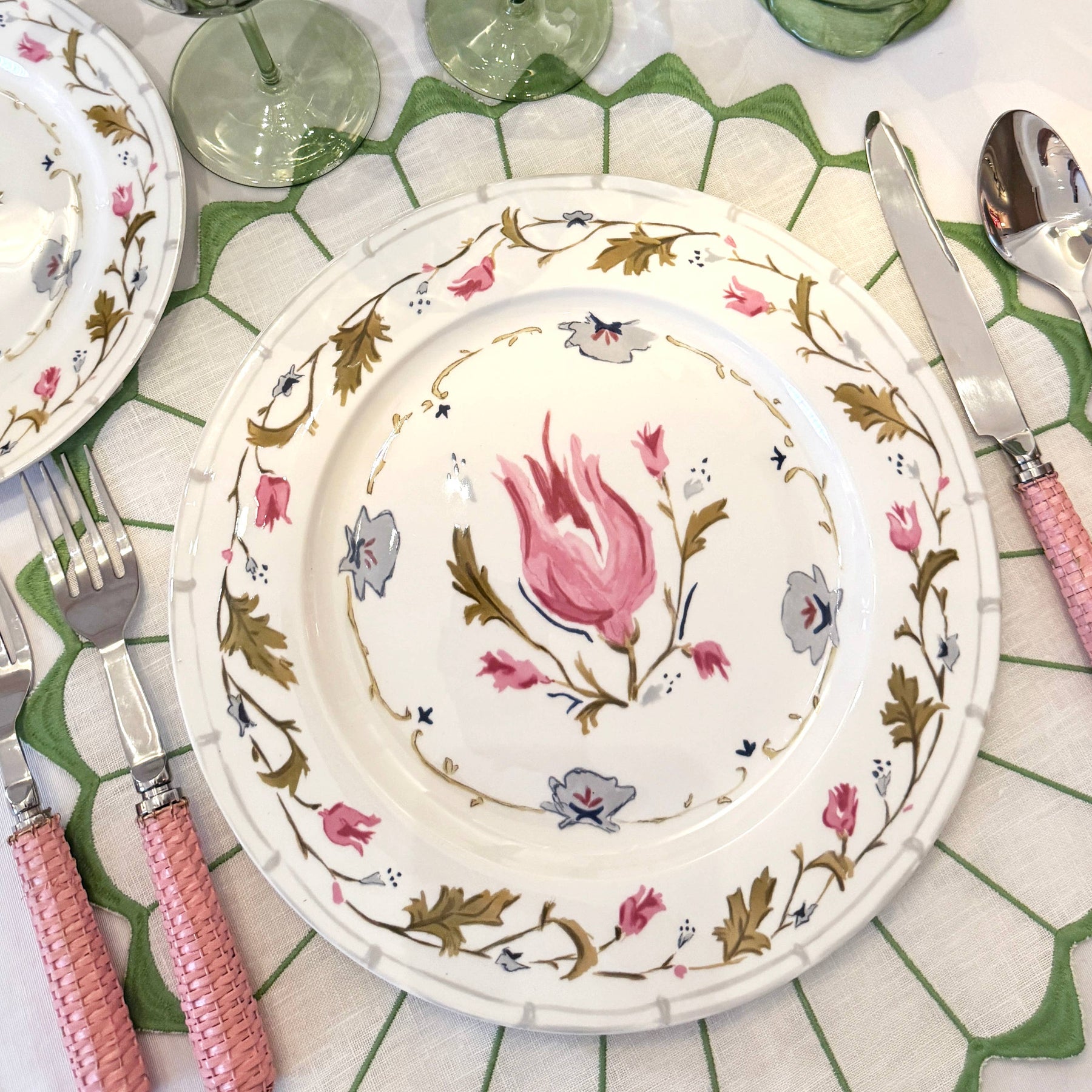 Each plate features a blooming tulip at the center, surrounded by a garland of delicate blossoms and leaves in soft pinks, muted blues, and warm olive tones. The border’s gentle scallop and subtle ribbon motif frame the floral scene, giving the design a refined, almost botanical‑etching quality. This palette and illustration style feels at once timeless and fresh—perfect for a garden‑inspired table, a light spring or summer dinner, or as a striking contrast against crisp linens and polished flatware.