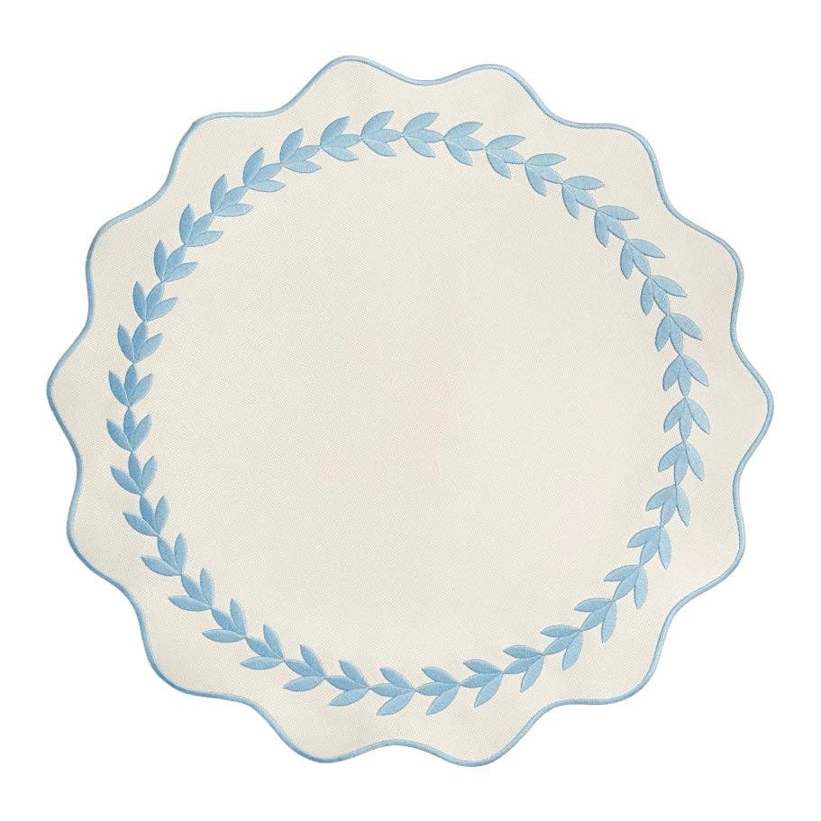 Delicate and refined, this White & Blue Ivy Embroidered Scalloped Placemat brings a graceful, garden-inspired touch to the table. Crafted in a softly textured woven fabric, the placemat features an elegant ivy motif embroidered in pale blue, encircling the center and finished with a gently scalloped edge.