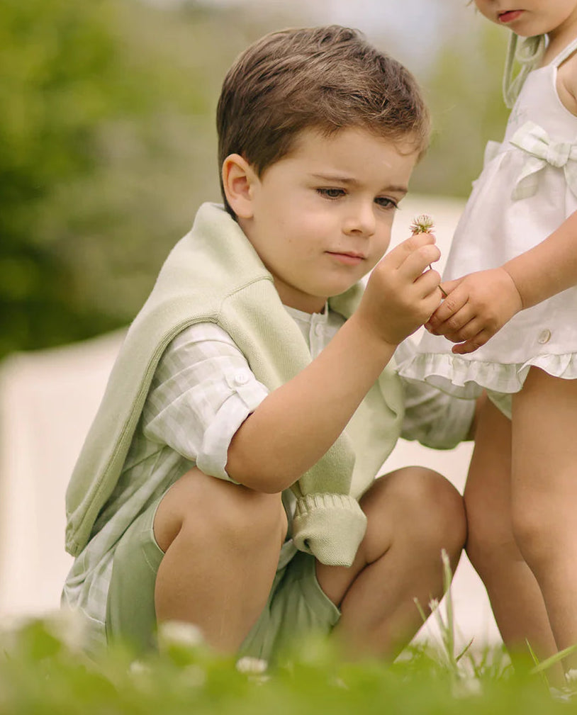 This long-sleeved children’s shirt by Paz Rodriguez features a soft green gingham pattern, refined mandarin collar, and classic front button closure.