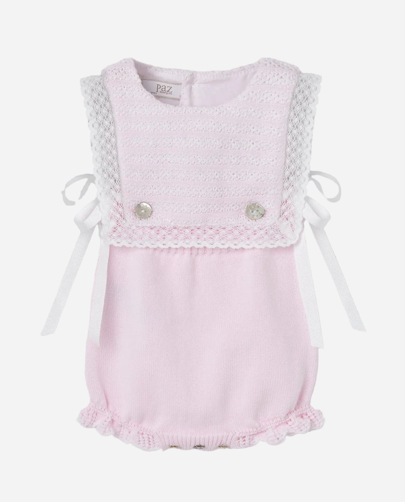 The Paz Rodriguez “Alaia” Knit Baby Romper is a timeless piece designed for baby’s earliest days. Crafted in soft cotton knit, it features a delicate tricot bodice with lace-trimmed straps and decorative buttons at the chest. Gentle ruffle detailing at the hem adds a sweet finishing touch — perfect for special moments or a beautiful newborn gift.