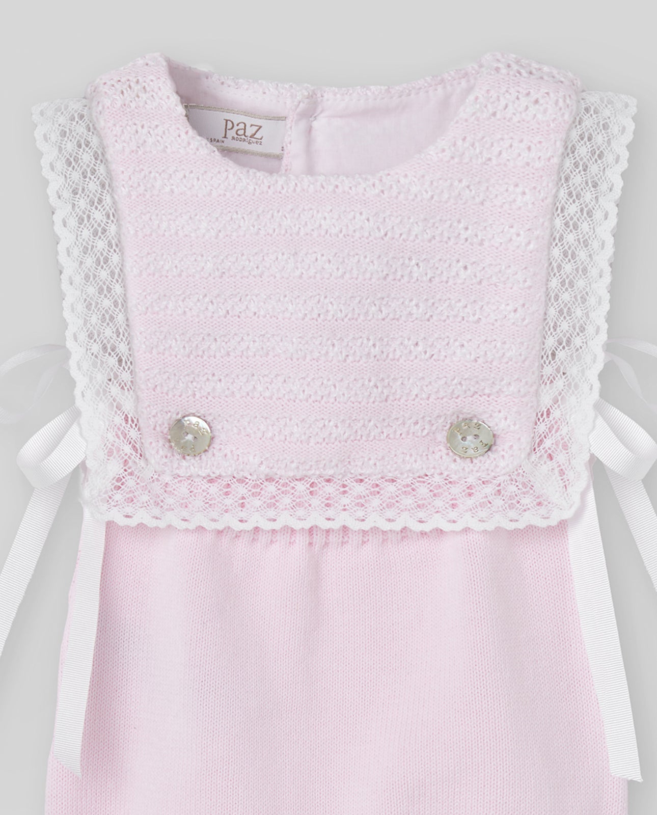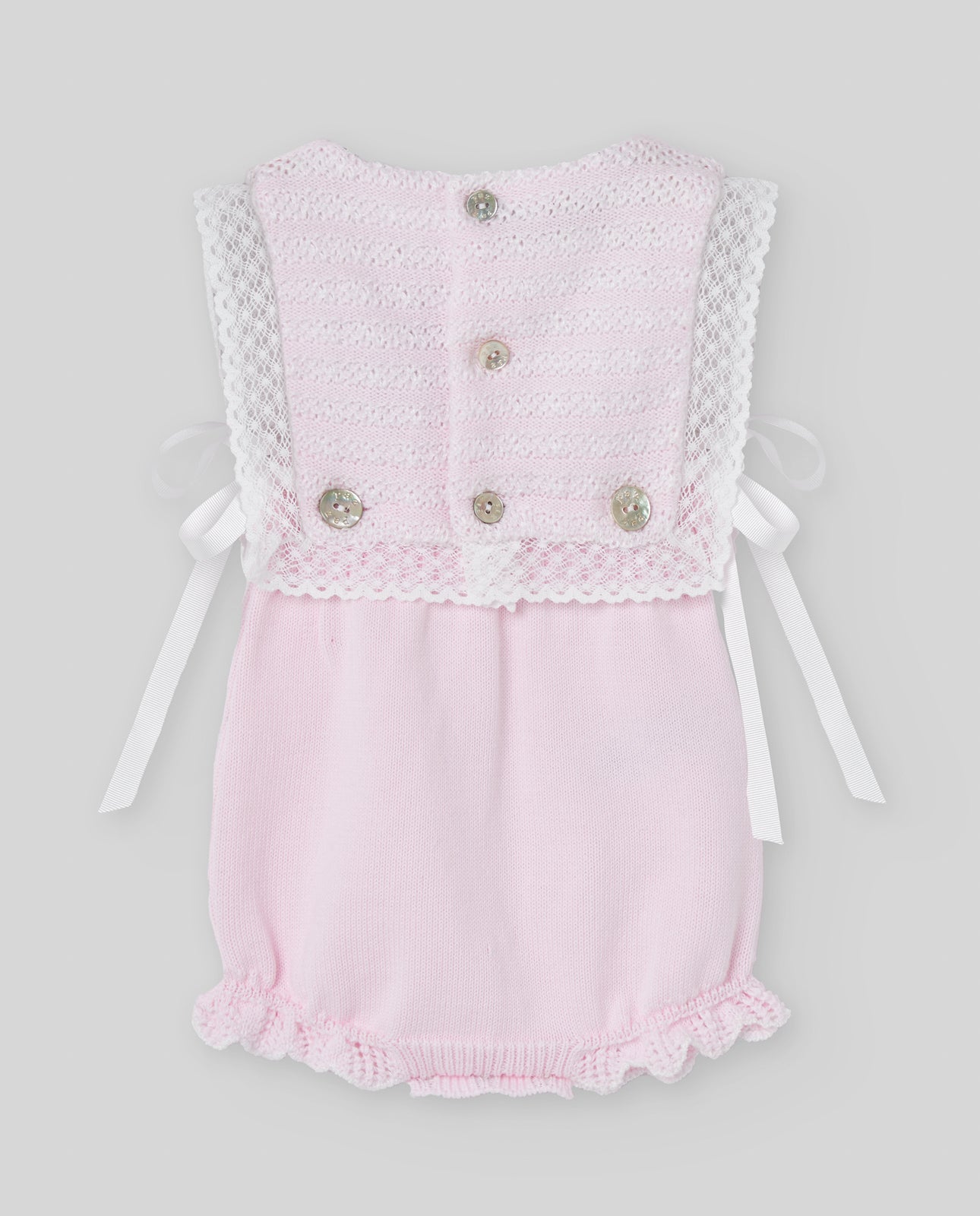 Pink romper with lace details and buttons on a light gray background
